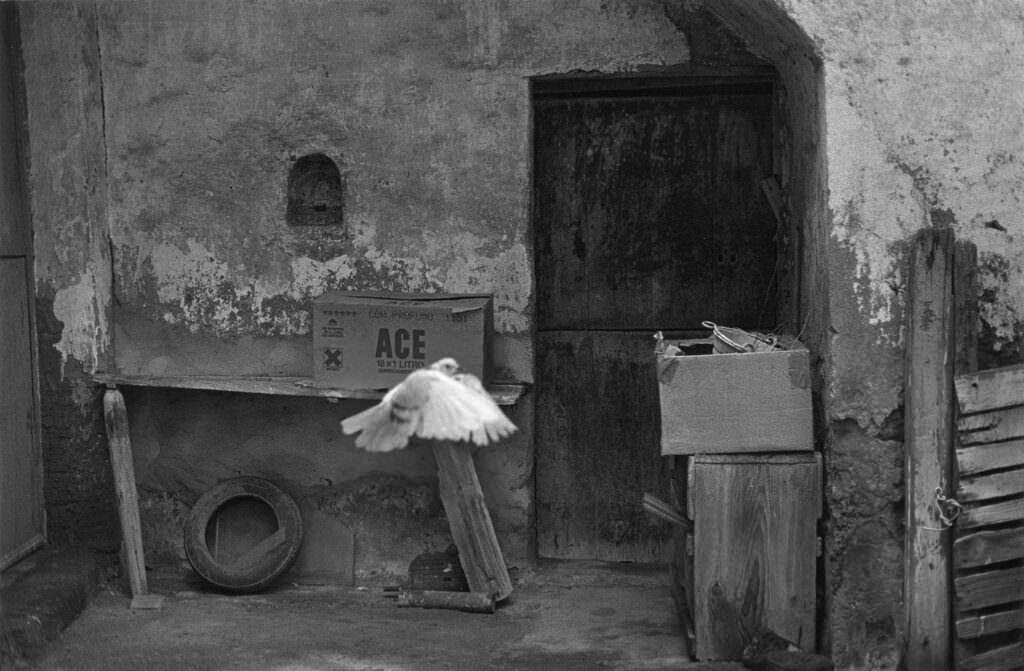 Human presence in these images is sparse and often peripheral. The island is never a backdrop; it is a living structure within which people appear as fleeting signs. Plossu avoids the climactic moment. He works in the interval, in what might be called the infra-ordinary, where apparent banality reveals its density. A sun-bleached wall, an empty road, a figure crossing the frame without claiming it—nothing is staged to impress. Light does not embellish; it exposes. Time does not freeze; it settles into the surface of the photograph. The viewer senses that the image was not seized but allowed to surface.