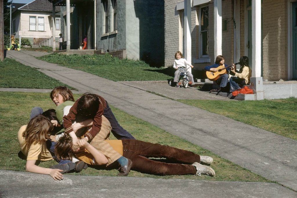 Catherine DeLattre and Fred Herzog both embraced the possibilities of color at a time when most photographers were still working in black and white. DeLattre, born and raised in Monongahela, Pennsylvania—a small town near the heavily industrial area of Pittsburgh—studied photography in the late 1960s and early 1970s, when training typically emphasized black-and-white processes. Nevertheless, she chose to work with a TLR Mamiya medium-format camera and Kodak color negative film.