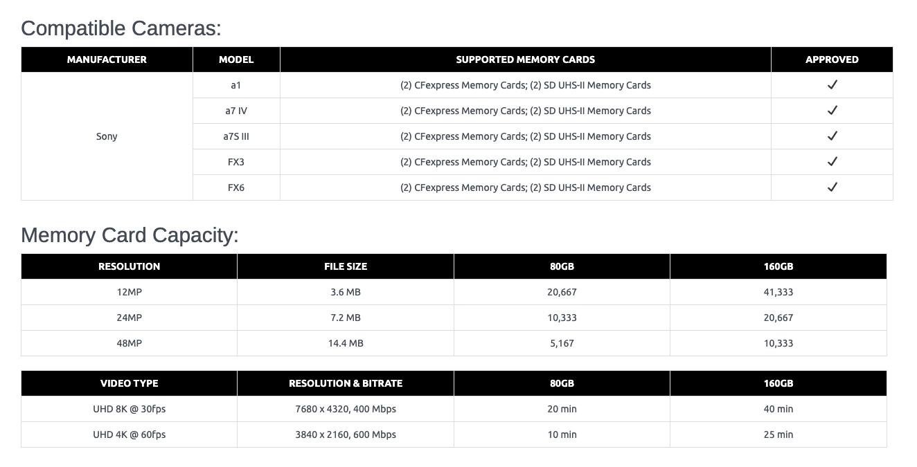 The new BLACK CFexpres Type A cards are only available in capacities of 80GB and 160GB, which a 160GB card only allows you to record 40 minutes of UHD 8K @30p (400Mbps). The highest capacity cards on the market are only 160GB. Delkin claims that every BLACK CFexpress Type A memory card has undergone extensive testing to ensure full functionality and performance in cameras including the Sony a1, a7S III, a7 IV, FX3 & FX6.