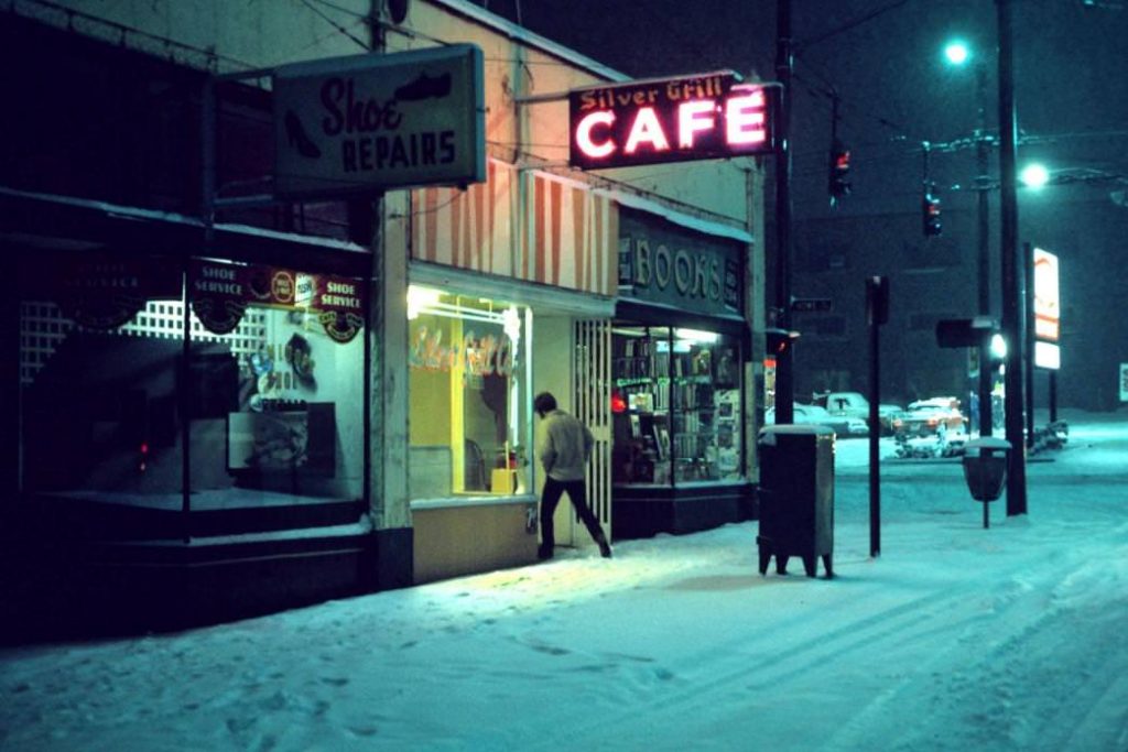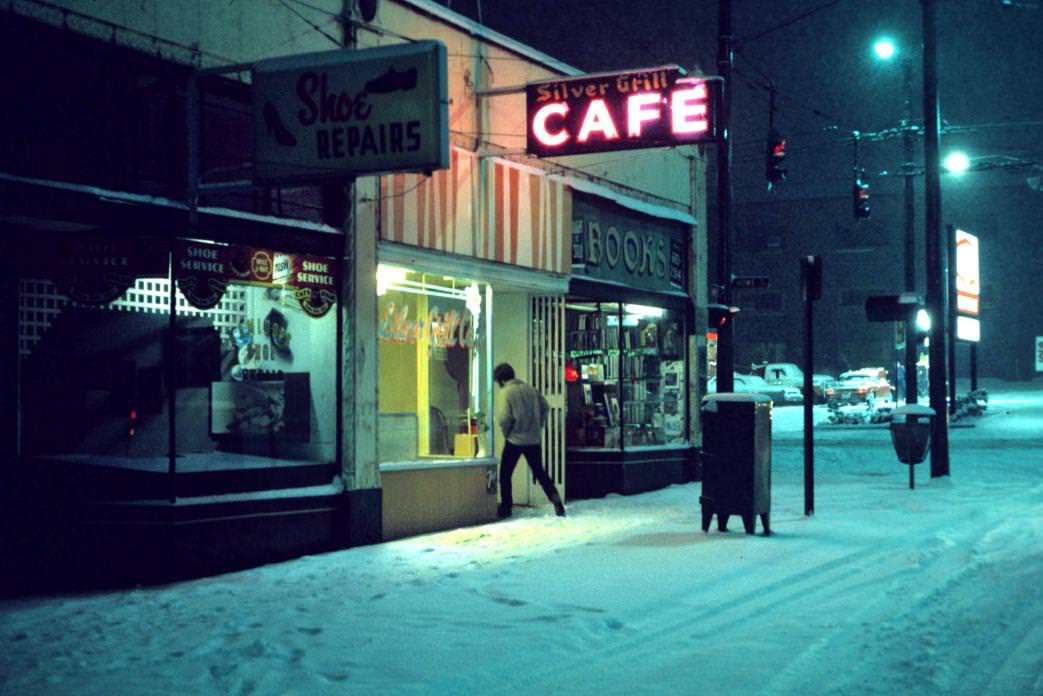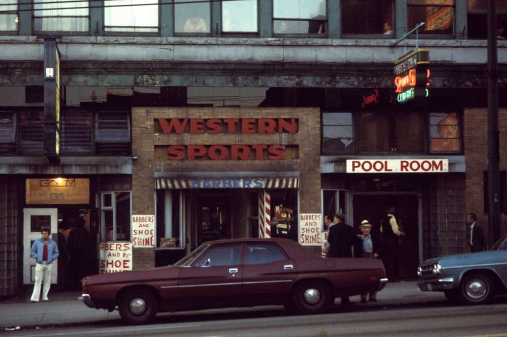 Greg Girard’s photographs of Vancouver from the 1970s and early 1980s capture a city on the verge of transformation, still functioning as a terminal port at the end of the railway line. Not long afterward—Expo 86 is widely regarded as the turning point—Vancouver entered the global spotlight and began to reinvent itself as a leisure-oriented metropolis closely tied to its natural surroundings, while also emerging as an attractive hub for real estate investment. In that earlier period, well before post-9/11 security measures restricted access to the working waterfront, many streets in the downtown core and east side ran directly to the water. The shoreline was dense with fishing wharves, shipping docks, and a network of bars and cafés frequented by dockworkers and sailors. Downtown pawn shops advertised outboard engines, chainsaws, and fishing equipment in their windows. Moving through these streets and staying in inexpensive hotels, Girard documented the everyday—and nocturnal—life of the city in which he was raised.