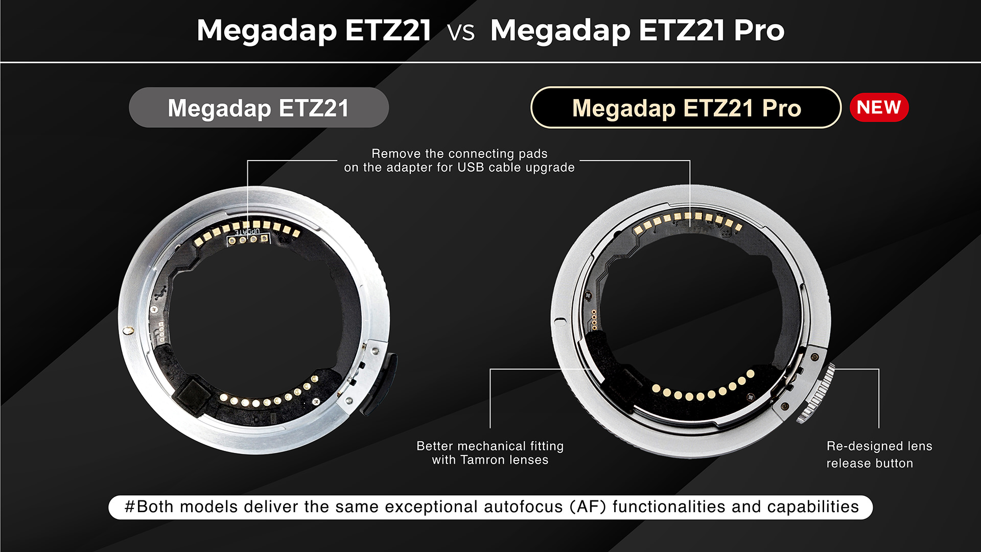 Megadap has released the ETZ21 Pro, its third generation Sony E-mount lens to Nikon Z-mount camera autofocus adapter. It still has a remarkably tiny design, but it no longer has a USB connector. Instead, it can now be updated using the attached Nikon camera.