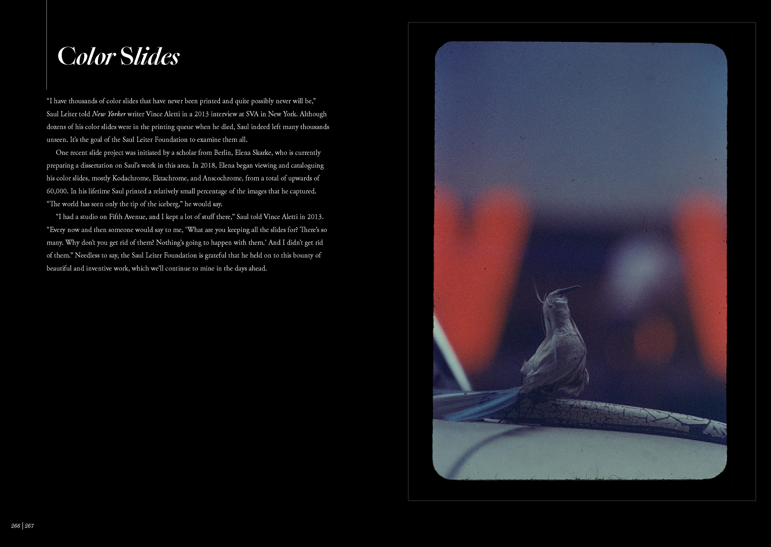 Saul Leiter was born in 1923 in Pittsburgh. He pioneered a painterly approach to color photography in the 1940s and produced covers for fashion magazines such as Esquire and Harper’s Bazaar before largely withdrawing from public attention in the 1980s.