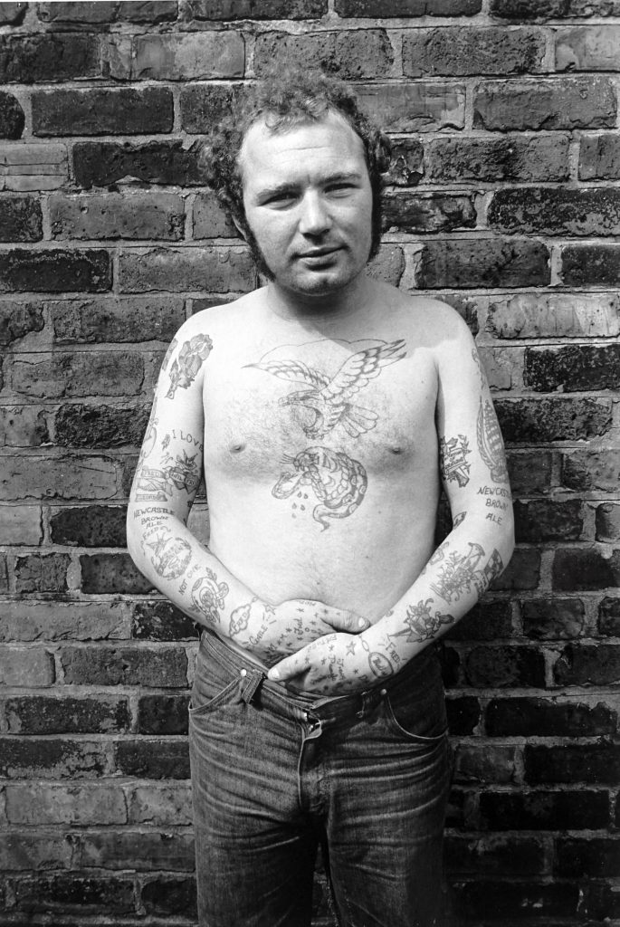 The Byker series includes a range of portraits, from traditional studio-style images to photographs of groups gathered in moments of leisure, playing dominoes or standing around a pool table – the surrounding walls and ceilings of their environment completely covered in graffiti. Some of the sitters are portrayed in their domestic settings, while others are shown at work or in more intimate circumstances.