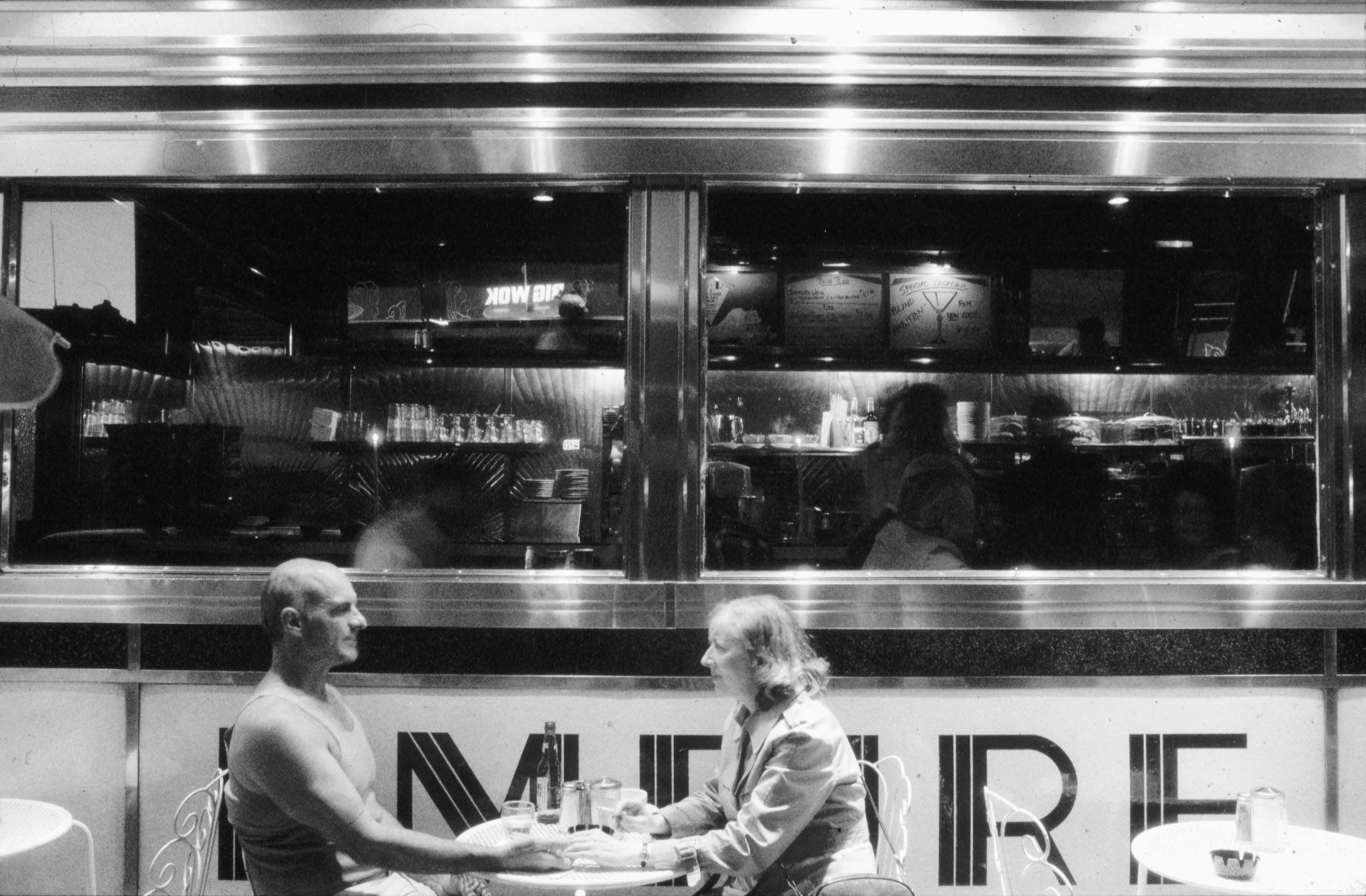 The Wall Street series from 1985, for example, thrives on its sharply drawn contrasts of light and dark. The black-and-white images were taken with Polaroid slide film on a Sunday morning; the otherwise bustling metropolis seems completely deserted. Structures and traces in the asphalt, wandering points of light reflected by the surrounding skyscrapers, and cars parked at the side of the road populate the deserted, almost dystopian situation. Intensive discussions with photographer Evelyn Hofer at the time inspired Erfurt to explore this topic in his work. In his series New York Restaurants, created around the same time, we encounter a few people, but mostly they disappear into a timeless, atmospheric blur. Everything becomes a stage in Erfurt’s early black-and-white photographs, almost as if Samuel Beckett himself had played a role in directing them. But a year later, the photographer was bathing everything in color, inspired by fellow photographer Joel Meyerowitz. This new direction can be seen in a second New York restaurant series – Erfurt’s first job for FAZ magazine – and also in a series taken shortly thereafter in Miami, imbued with the city’s characteristic pastel Art Deco color scheme. In a series he shot in Las Vegas, also in 1986, the colors became clearer, less fragmented. In those photographs, the light of the sky is as brilliant as the colorful neon signs of the city’s motels and casinos.