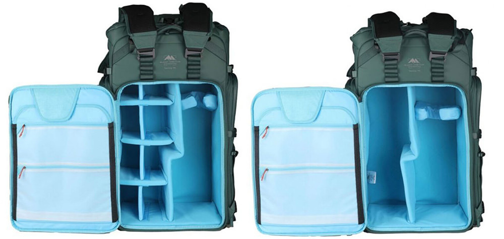 Internally, the backpack features customizable dividers, allowing the space to be reconfigured depending on the intended use — whether for a dense arrangement of smaller lenses, a standard travel photography kit, or a combination of camera gear and personal items such as clothing or provisions for outdoor activities.