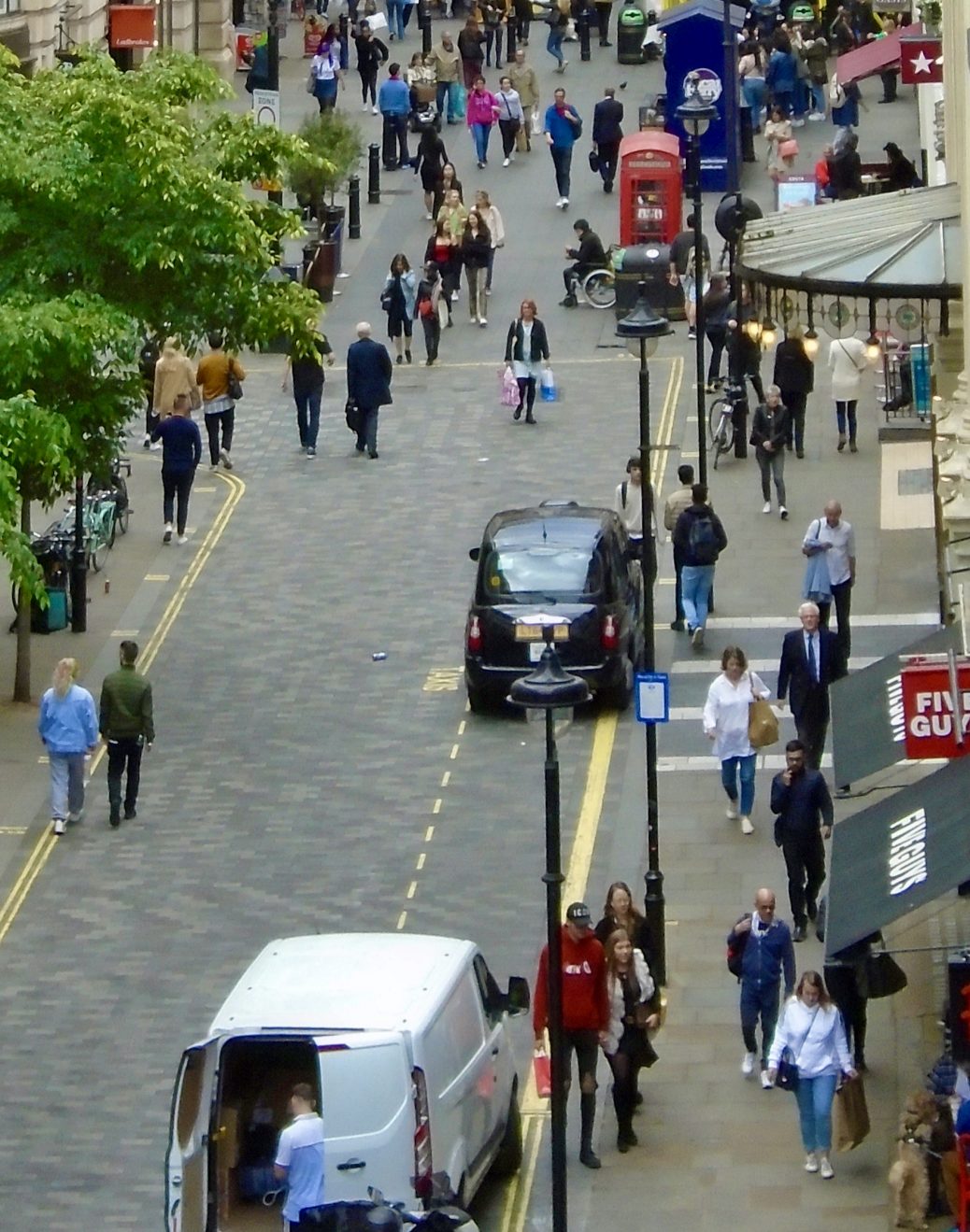 A lunchtime in Carnaby Street. Taken from a window in Liberty’s store in July 2019. Shows many aspects of London life including delivery vans, dogs, taxis, and red phone boxes.