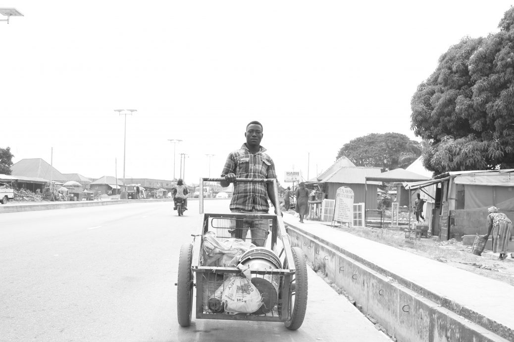 Here’s the strongest in our society. Called ‘Kwalabe’, he fends for himself by collecting plastic waste, rusty iron, bad car batteries, torn mattresses, and other scraps daily; from sunrise to sunset. Even on Fridays when the call for prayers tolls, he’d to rush to Mosque after which he continues pushing his rugged truck.