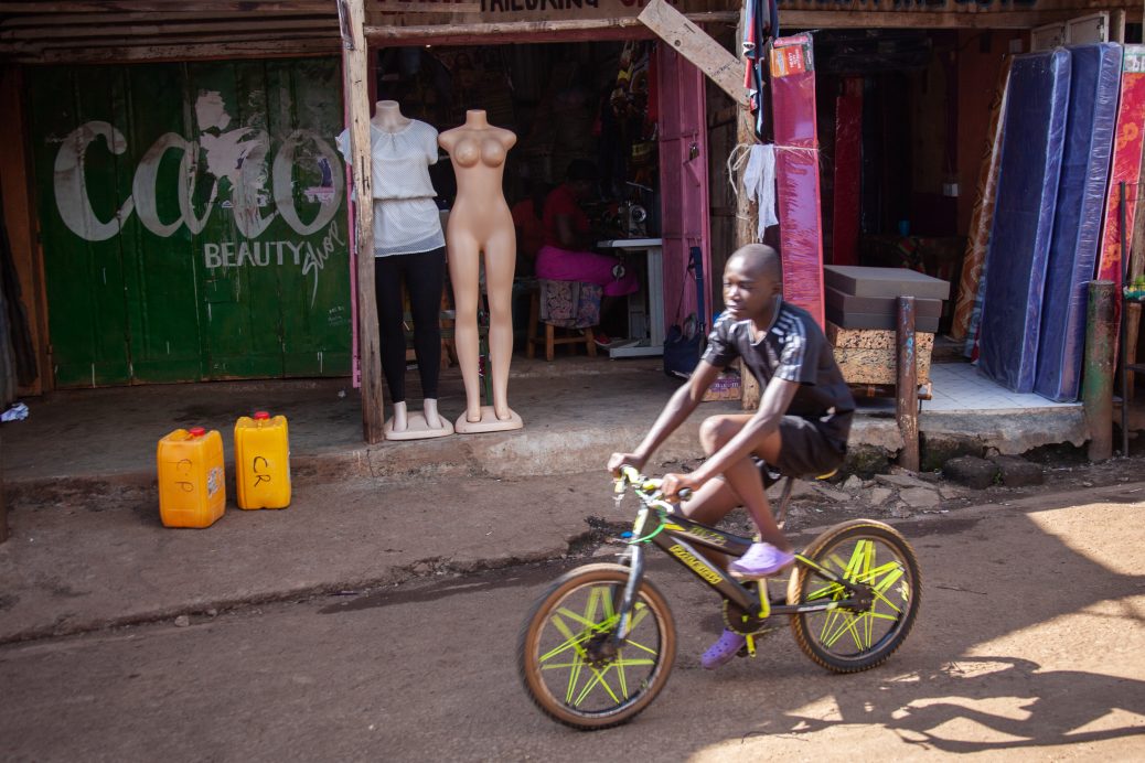 Unclothed A boy rides a bicycle near a local tailor’s shop situated in the streets of Kibera in Nairobi, 9th January 2020. Nairobi, Kenya 0 likes