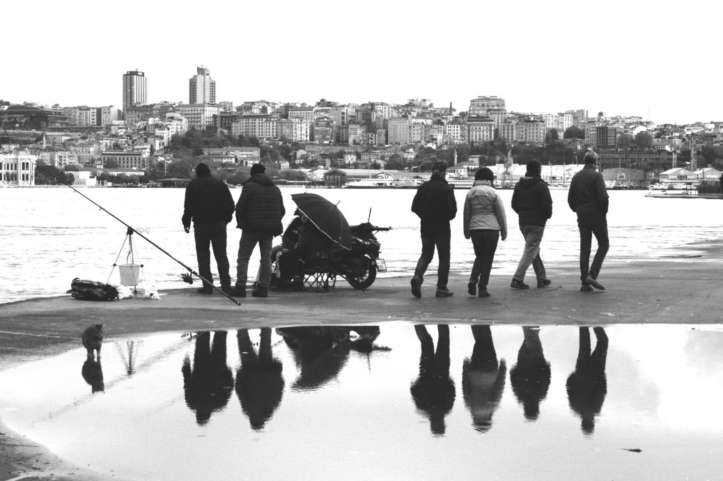 When I saw my friends walking along the beach I thought they were as a whole with the landscape, the fishermen and the cat, all reflected in the puddle.
